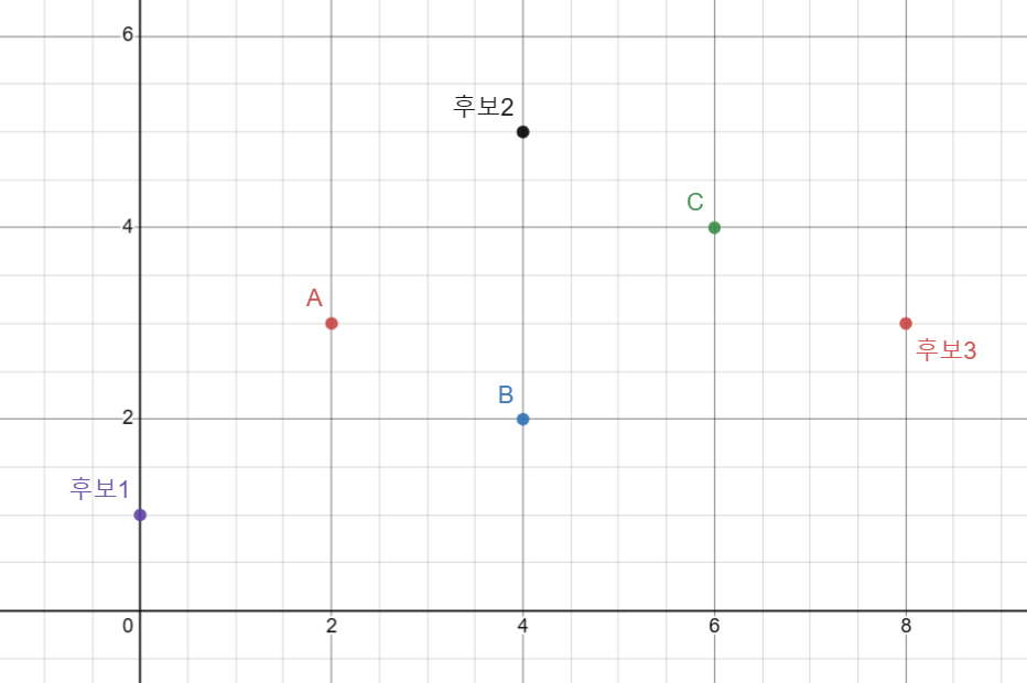 Desmos를 이용해 우리가 처한 상황을 시각화 해보자. 점 A, B, C가 문제에서 주어진 세 점이라고 가정하고 후보1, 후보2, 후보3은 평행사변형을 완성시킬 수 있는 점들이라고 할 수 있다.