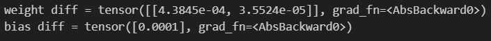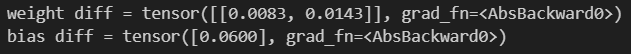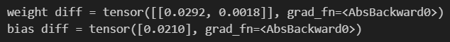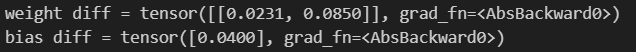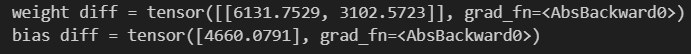 print(f"weight diff = {abs(data.w.reshape(1, -1)-model.w.reshape(1, -1))}\nbias diff = {abs(data.b-model.b)}")