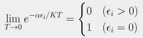 No matter what $\epsilon_{i}$ is, the probability of a particle that has positive energy is close to zero. However particles with zero energy will always be found. Thus all the particles are static(frozen).