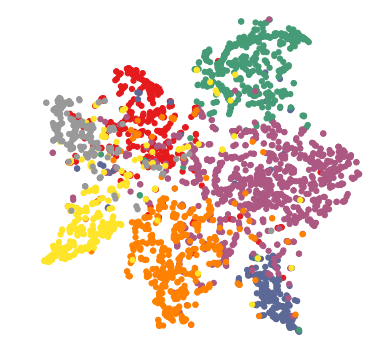 위 이미지는 5%의 known label 데이터만 갖고 GCN을 적용하여 학습한 결과이다. 자세히 보면 얼추 군집을 생성함과 동시에 분산되게 class가 퍼져 있음을 알 수 있다. 만약 laplacian regularization을 사용했다면 known label들을 기점으로 clustering 되었을 확률이 매우 크다.