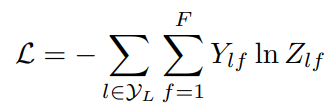 이후에 크로스 엔트로피로 손실 함수를 계산해 주면 끝이다. 여기서 YL은 라벨이 있는 노드들의 indices를 의미한다. 즉 라벨이 있는 노드(Yl)와 예측 노드(Zl)를 크로스 엔트로피 해준다.