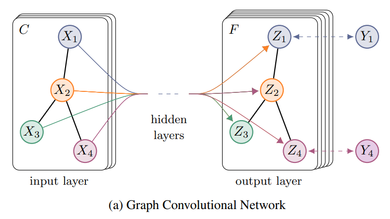 C는 피쳐의 개수, F는 필터의 개수(예측하는 라벨의 개수)를 나타낸다. X1,X2,X3,X4는 개별 노드의 피쳐를 나타낸다(노드 하나당 피쳐는 3개임을 유추할 수 있음). 마찬가지로 $Z_1, Z_2, Z_3, Z_4$는 라벨 하나당 해당하는 확률(softmax로 구해짐)을 나타낸다(총 classify 가능한 라벨이 5개임을 알 수 있음). 즉 그림에서 알 수 있듯이 피쳐가 각각 필터(가중치)를 동반한 신경망 안으로 학습되고 그 결과로 Z가 나오고 앞에서 언급했듯이 손실 함수는 라벨이 있는 노드만 가지고 진행된다. 즉 1번 노드와 4번 노드만 라벨을 갖고 있음을 알 수 있다.