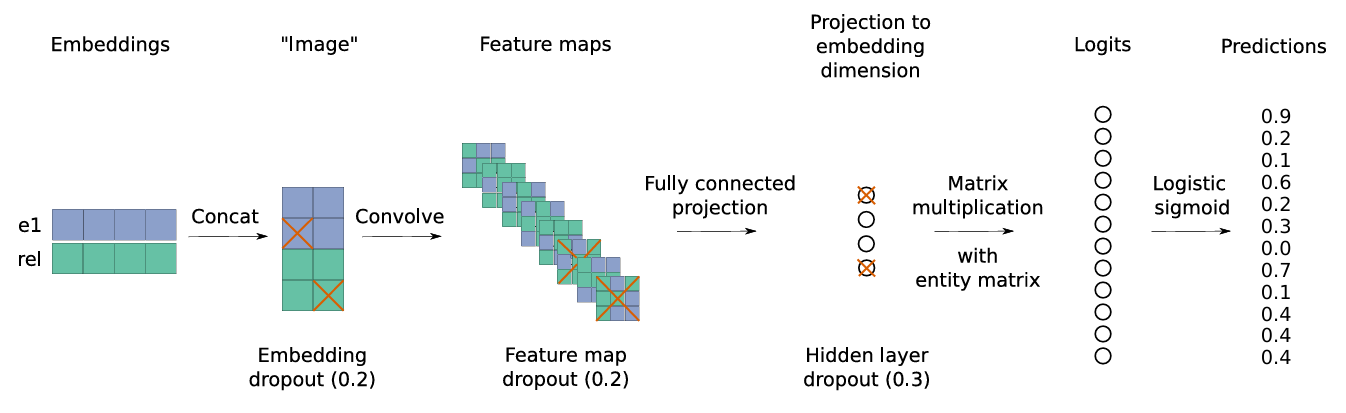 step5 : 살짝 그림과 수식이 맞지 않다. 분명 수식대로라면 실수값 하나만 나와야 하는데 그림에서는 여러 개의 결괏값(logit)이 보여진다. 그 이유는 논문에서는 1-N scoring 방식을 채택했기 때문이다. 이 방법은 1개의 s, r에 대해 여러개의 eo를 한 번에 dot product 하여 여러 개의 score를 학습할 수 있는 방법이다. 이때 N은 training set에 있는 전체 entity다. 이에 반해 1-0.1N scoring(각 scoring 계산당 training의 10%만 사용)도 고려를 해보았지만 forward pass속도는 25% 빨라진 반면 수렴 시간은 230% 증가하여 이 연구에서는 1-N scoring을 고수한다.