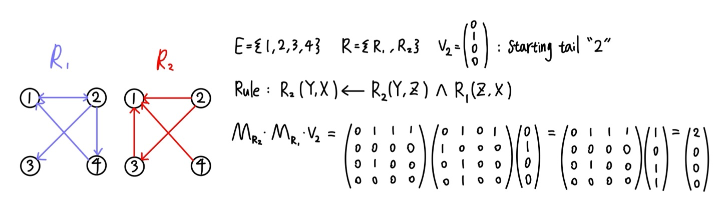 위의 결과, (2,0,0,0) 벡터가 우리의 $s$가 되었는데, 이것은 entity 2를 시작으로 하고 $R_1 \to R_2$로 이어지는 경우의 수이다. (2,3,1)과 (2,4,1) 총 2개가 있음을 알 수 있고 이것이 $s$에 반영된다. 결국 우리는 $s$가 $y$집합과 일치하기를 바랄 뿐이다. 이는 rule의 길이가 2가 넘어갈 때도 적용 가능하다.