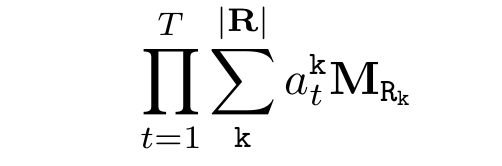$T$는 rule의 길이이고 $k$는 하나의 정수로 표현된 모든 relation에 대해 개별 relation을 나타낸다. 즉 길이 $T$의 body length를 갖는 rule들을 모조리 계산해 버리자는 것이다. 이산 공간 문제를 해결하기 위해 공평하게(?) 모든 경우의 수를 다 보자는 것이다. $a_t^k$는 깊이 $t$에서 relation $k$가 얼마나 신뢰성 있는지(confidence)를 나타내는 파라미터이다. 여기서 "깊이"에 대해 "rule을 구성하는 relation들에 대해 t번째 relation에 대한 state"로 정의한다. 즉 그림 1에서 $T=2$일 것이고 $R_1$이 첫 번째, $R_2$가 두 번째기 때문에 $R_1$에 대한 파라미터는 $t=1$인 것이고 반대로 $R_2$는 $t=2$에 해당한다.