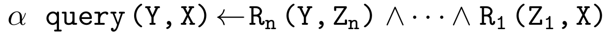 여기서 $\alpha \in [0,1]$는 이 rule($query(Y,X)$)의 confidence이고 $R_1,\cdots ,R_n$은 KB의 relation들이다. 이때 주어진 entity $x$에 대해 $y$의 적합도(score)는 $query(Y,X)$를 구성하는 rule들의 confidence 합이다.