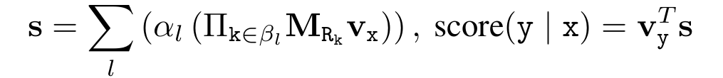 $l$은 가능한 모든 rule을 인덱싱 하고(추상적인 의미가 많이 담겨있지만 간단하게 "모든 relation"이라고 이해해도 무방하다. 왜냐하면 rule과 relation은 사실상 같기 때문이다.) $\alpha_l$은 해당 rule $l$의 confidence이다. $\beta_l$은 $l$을 구성하는 relation의 순서이다(예를 들어 그림 1의 경우에 $\beta_l=[R_1,R_2]$). 추론 과정에서 벡터 $\textbf{v}_x$에 대해 다음과 같이 score를 정의할 수 있다.