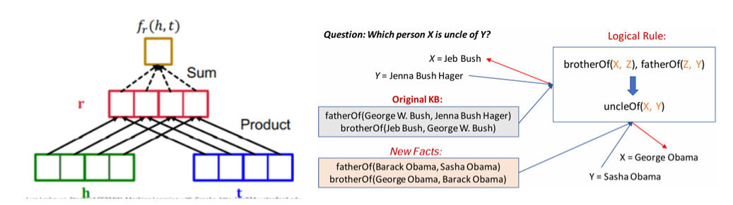 이를 해결하기 위해 대표적으로 KB에 존재하는 데이터(triplet)들을 이용해서 새로운 것들을 추론해 내는 접근이 있다. 크게 두 가지로 나뉘는데, 첫 번째는 entity와 relation에 대해 임베딩 벡터 또는 텐서를 학습하는 representation learning과 두 번째인 KB에서 동시 발생하는 빈번한 패턴들을 익혀 논리적인 규칙들을 학습하는 rule mining이 있다.