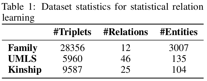 데이터 셋은 UMLS, Kinship, Family를 사용하였다.