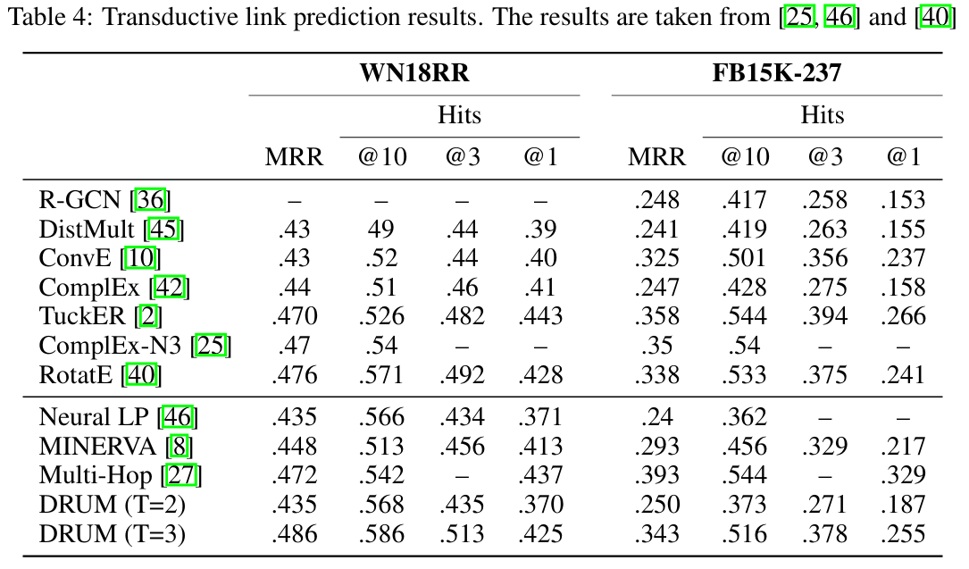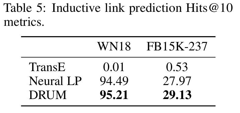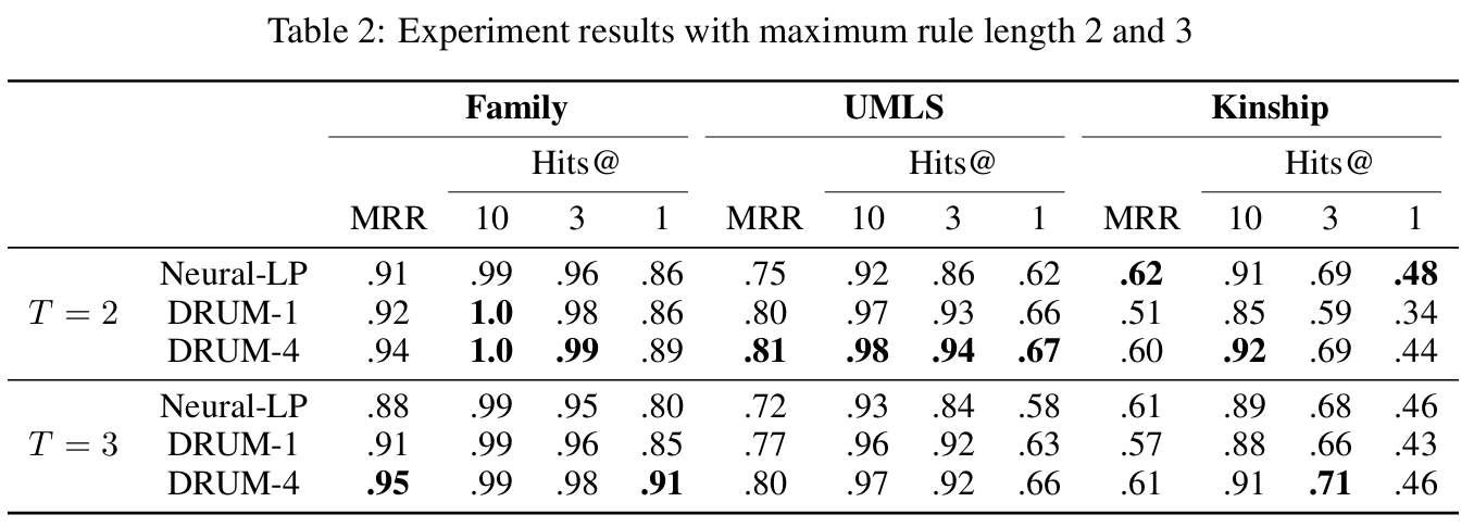 DRUM을 Neural LP와 비교한다. 이때 rank size의 효과를 보기 위해 $L=1$인 DRUM-1과 $L=4$인 DRUM-4에 대해도 실험을 각각 진행해 본다. 다른 representation model 모델들(e.g., ComplEx, ConvE, NTPs, MINERVA)에 대해서 비교를 진행하지 않았는데, 왜냐하면 이들은 inductive 하지 못하기 때문이라고 연구에서 밝힌다. 솔직히 무슨 연관인지는 모르겠다. 리뷰어들의 리뷰를 보니 이 부분을 다들 지적하긴 하는 듯 하지만 아무튼 결과는 아래와 같다.