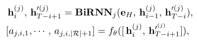 앞에서도 살펴보았듯이 분명 rule의 구성에도 맥락이 존재한다. 즉 앞에 어떤 body atom이 차지하고 있다면 그 뒤로는 한정된 relation들만 올 수 있는 것이다. NLP에서도 이 "맥락"을 잡기 위해 제안된 것이 BiRNN이기 때문에 본 연구에서도 BiRNN을 사용하였다. 수식을 살펴보면 $f_\theta$ 함수에 왜 $i$ 깊이와 $T-i+1$ 깊이만 포함되냐고 의문이 들 수도 있지만 RNN 특성상 forward 입장에서는 순방향 구성, backward는 body의 역방향 구성을 학습하는 단계 아닌가 추측해 본다.