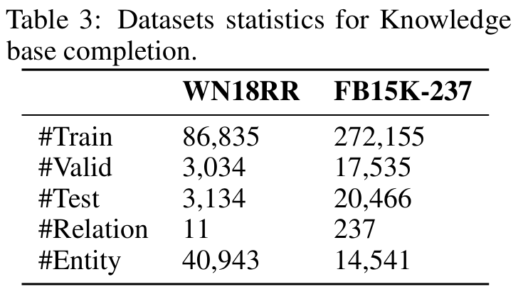 데이터 셋은 WordNet(WN18), Freebase(FB15k)와 그로부터 도출된 더 어려운 WN18RR, FB15k-237까지 사용하였다.