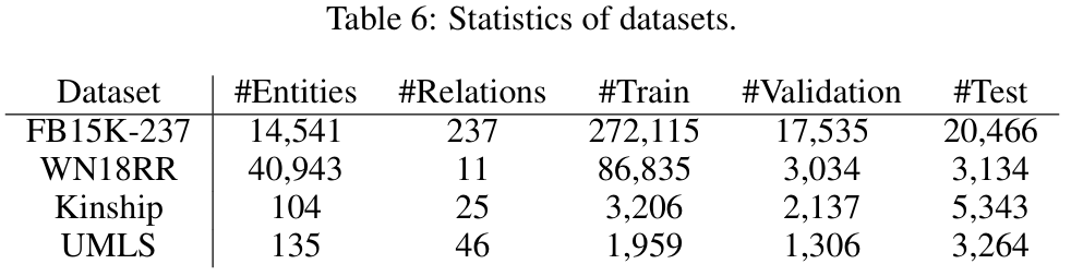 Dataset : FB15k-237, WN18RR, Kinship, UMLS. Kinship과 UMLS는 정형적인 split이 존재하지 않기 때문에 본 연구에서 무작위로 training(30%), validation(20%), testing(50%)으로 나눈다.