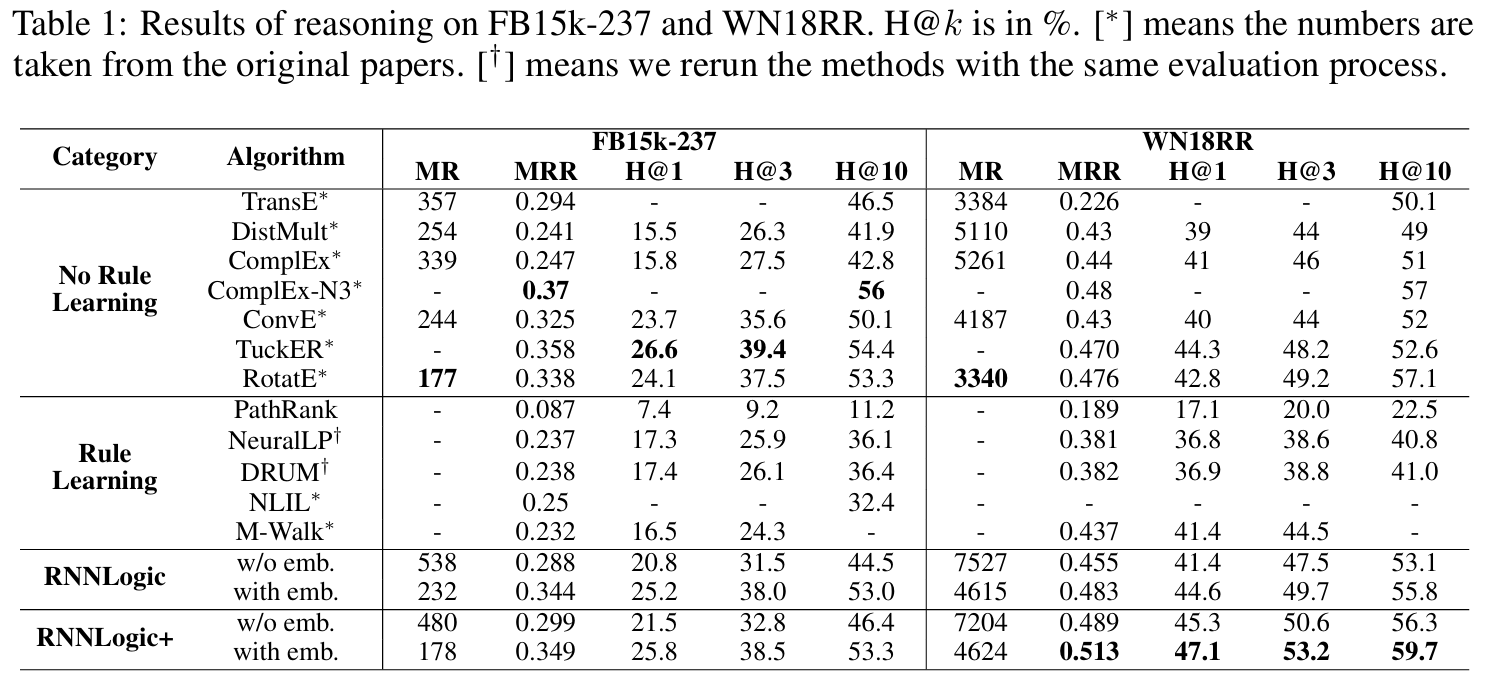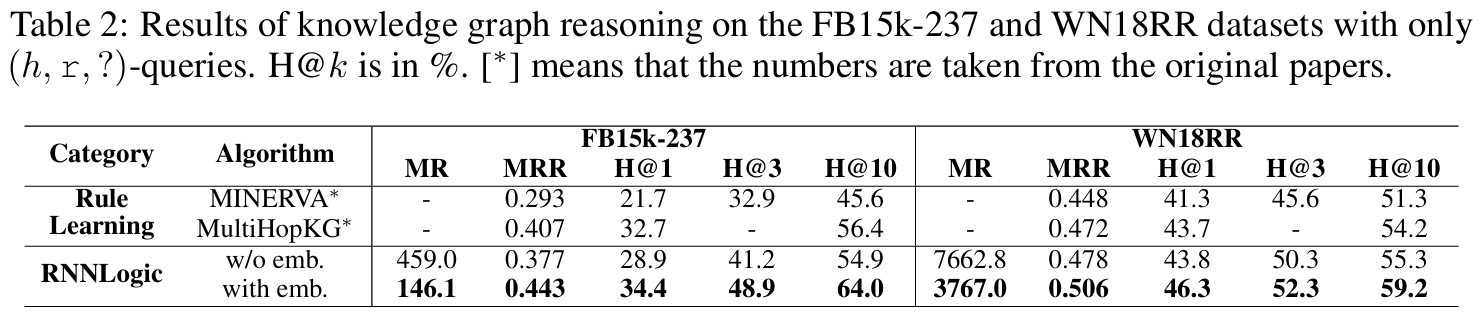 추가로 MINERVA(2018)과 MultiHopKG는 $(h,r,?)$만 사용하여 이들에 맞추기 위해 RNNLogic도 이들과 비교평가할 때는 $(h,r,?)$만 사용한다.