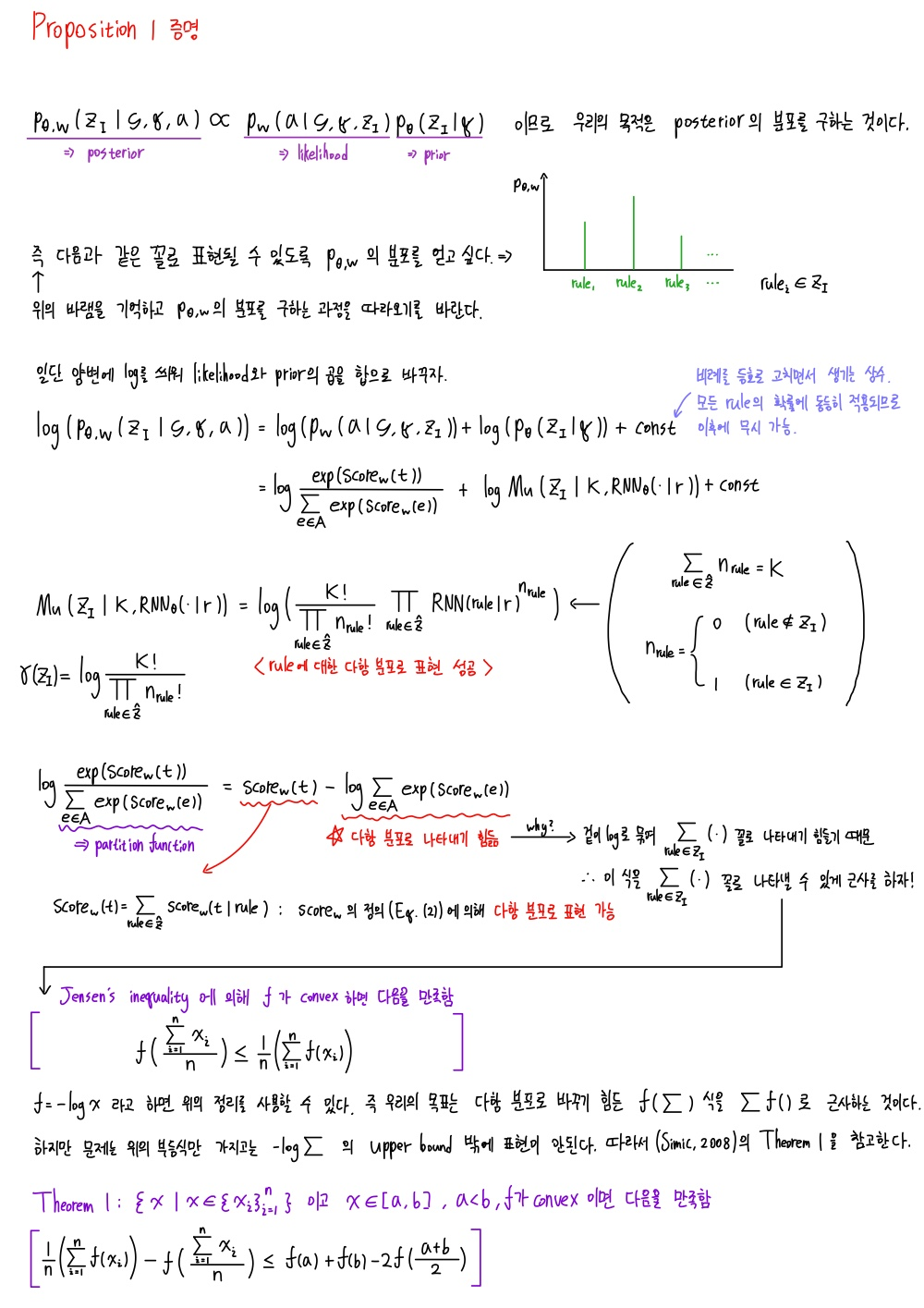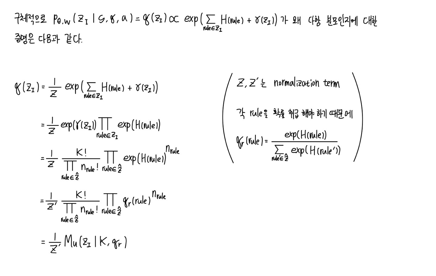 결국 log-posterior를 다항 분포 $q(\textbf{z}_I)$로 나타낼 수 있다. 이에 대한 증명도 appendix에 남긴다. 우리가 최종적으로 뽑고 싶은 high-quality rule을 $q(\textbf{z}_I)$에서 뽑는다고 해도 무방하며 이렇게 최종적으로 뽑힌 rule들을 $\hat{\textbf{z}_I}$이라고 하자. 즉 각 rule의 확률을 아래의 수식으로 구할 수 있는 것이다(rule에 영향을 받는 값이 $H$뿐이기 때문).