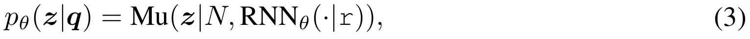 여기서 $r$은 쿼리 $\textbf{q}$와 관련된 head relation이고 $r_i$는 body atom들, $r_{END}$는 relation의 연속의 끝을 표시하는 토큰으로 이해할 수 있다. 즉 우리는 $r$을 필두로 $r_i$를 구성하는 방법을 고안하면 되는데 이 문제에 대해서 RNN이 제격임을 알 수 있다. 이때 우리가 원하는 것은 $i$번째 relation의 후보군에 대한 확률 분포이다. 따라서 우리는 아래와 같이 RNN을 사용해 $p_\theta(\textbf{z}|\textbf{q})$를 표현하는 다항 분포를 얻을 수 있다.
