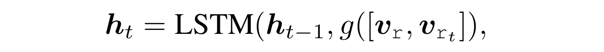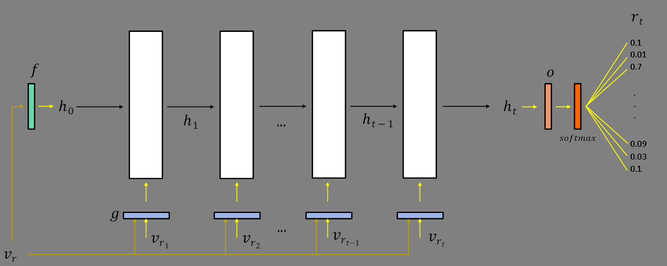 위 그림은 $[r,r_1,r_2\cdots r_t]$가 주어진 상태를 전제한 상황이다. 즉 과거의 state들을 갖고 다음 state를 도출하여 그에 상응하는 $r_{t}$의 확률 분포(relation 집합이 $R$이라면 $|R|$개의 relation에 대한 확률 분포를 생성)를 알아낼 수 있는 것이다. 여기서 드는 의문은 해당 깊이에서의 hidden state가 있어야 relation을 정할 수 있는데 정작 그 state를 구축하는 데에 그 relation에 대한 파라미터 벡터가 필요하다.