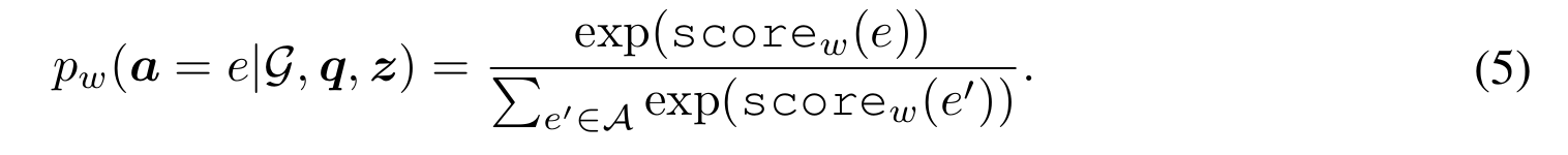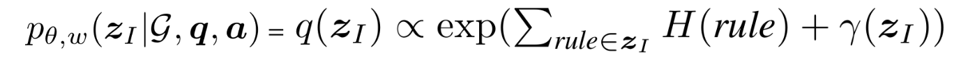RG에서 받은 $\textbf{z}$를 이용해서 $p_w(\textbf{a}|G,\textbf{q},\textbf{z})$를 모델링하고자 한다. 주어진 쿼리 $\textbf{q}=(h,r,?)$에 대해 compositional rule과 $G$를 활용해 다른 candidate answer로 향하는 grounding path들을 찾을 수 있다. 즉 $\textbf{z}$와 BFS(또는 인접 행렬 이용, 이 부분은 논문에 나와있지는 않고 openreview에서 저자들이 밝혔다)를 사용해 이 정보들을 조합해 특정 candidate answer($e\in A$)에 대한 score를 얻을 수 있다.
