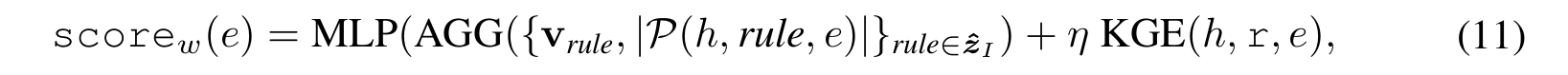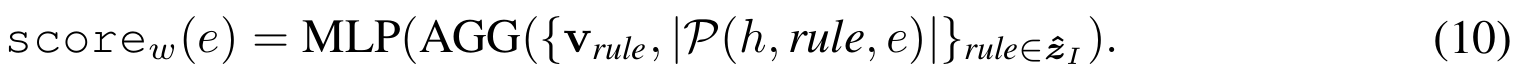 생성된 high-quality rule이 3개가 있고 이에 따라 생성된 candidate answer도 3개라고 가정하면 각 rule에 대한 임베딩을 aggregate(이때 각 임베딩에 대한 weight는 $P(h,rule,e)$의 크기이다)하고 이렇게 나온 최종 임베딩을 MLP에 전파시켜 score을 얻는다(Aggregator의 종류는 PNA(Corso et al., 2020)이다). 이 score들로 Eq. (5)를 계산하는 데에 사용될 수 있다.