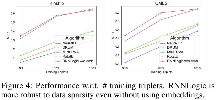 아래는 적은 개수의 rule들 갖고도 높은 MRR 점수를 보임을 증명한다. 따라서 RNNLogic에서 학습한 rule은 high-quality임을 증명해 준다.