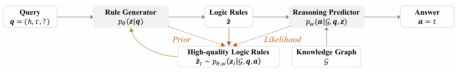 쿼리 $\textbf{q}$는 하나의 triplet input 데이터이고 이 정보는 Rule Generator(이하 RG)에 들어가 $\textbf{q}$에 대한 rule의 다항 분포 $p_\theta (\textbf{z}|\textbf{q})$를 생성한다. 이를 통해 rule의 집합 $\hat{\textbf{z}}\subset\textbf{z}$을 뽑아내고 이를 Reasoning Predictor(이하 RP)로 전달해 $p_w(\textbf{a}|G,\textbf{q},\textbf{z})$를 생성해 주어진 그래프 $G$, 쿼리 $\textbf{q}$, $\textbf{z}$를 활용해 쿼리에 대한 예측 정답들($\textbf{a}$)을 뽑아낸다($\hat{\textbf{z}}$를 사용해야 하는 것 아니냐고 생각할 수 있지만 이에 대한 이유는 $\hat{\textbf{z}}$가 위 형식 제안 후에 간편성을 위해 제시된 것이기 때문이다). RG를 prior, RP를 likelihood로 취급하여 샘플링된 rule 중에서 가장 high-quality인 rule들을($\hat{\textbf{z}}_I$) 추린다. 그리고 이 결과를 이용해 RG를 업데이트한다. 학습은 이런 일련의 과정들로 이루어지며 testing에서는 RG 계산 이후 RP를 거쳐 바로 answer를 도출할 수 있게 된다. 이렇게 다른 sector에 다른 역할을 부여해준 것은 EM 알고리즘에서 영감을 얻었다고 하며 이 알고리즘이 확률 및 통계 값들을 활용하는 것을 RNNLogic에서 그대로 이어받았다.