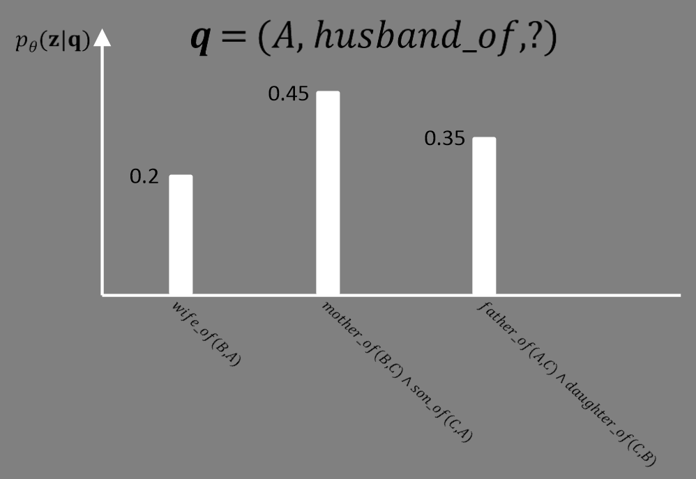 RG에서 받은 z를 이용해서 pw(a|G,q,z)를 모델링하고자 한다. 주어진 쿼리 q=(h,r,?)에 대해 compositional rule과 G를 활용해 다른 candidate answer로 향하는 grounding path들을 찾을 수 있다. 즉 z와 BFS(또는 인접 행렬 이용, 이 부분은 논문에 나와있지는 않고 openreview에서 저자들이 밝혔다)를 사용해 이 정보들을 조합해 특정 candidate answer(e∈A)에 대한 score를 얻을 수 있다.