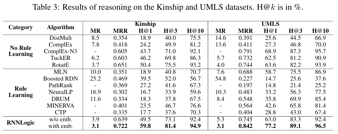 추가로 MINERVA(2018)과 MultiHopKG는 (h,r,?)만 사용하여 이들에 맞추기 위해 RNNLogic도 이들과 비교평가할 때는 (h,r,?)만 사용한다.