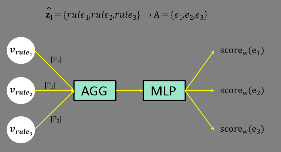 생성된 high-quality rule이 3개가 있고 이에 따라 생성된 candidate answer도 3개라고 가정하면 각 rule에 대한 임베딩을 aggregate(이때 각 임베딩에 대한 weight는 P(h,rule,e)의 크기이다)하고 이렇게 나온 최종 임베딩을 MLP에 전파시켜 score을 얻는다(Aggregator의 종류는 PNA(Corso et al., 2020)이다). 이 score들로 Eq. (5)를 계산하는 데에 사용될 수 있다.