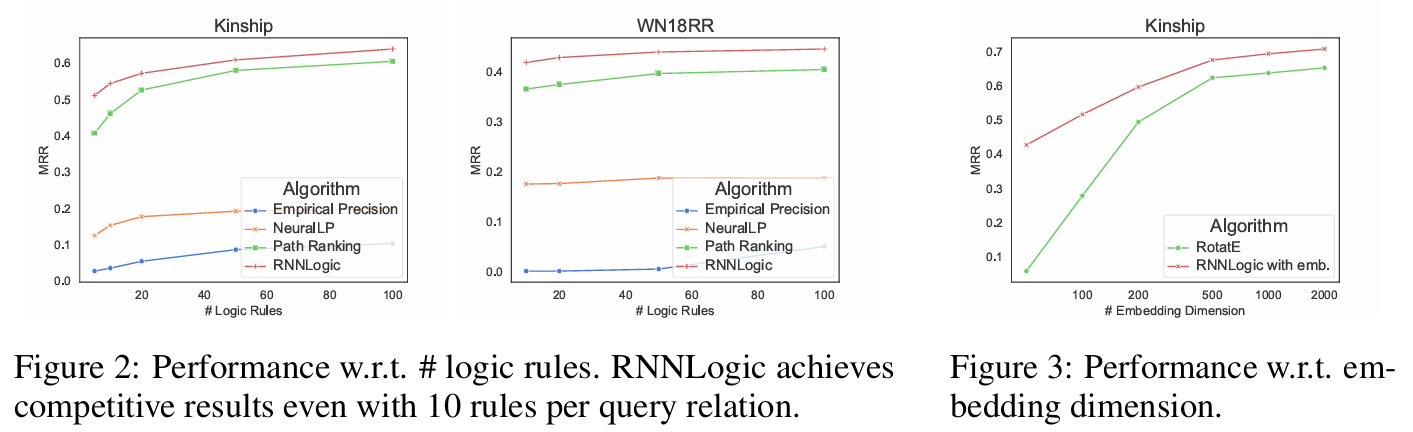아래는 적은 개수의 rule들 갖고도 높은 MRR 점수를 보임을 증명한다. 따라서 RNNLogic에서 학습한 rule은 high-quality임을 증명해 준다.