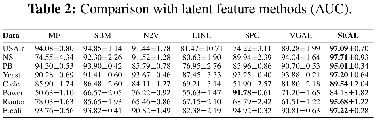 위는 latent feature들을 사용하는 모델들과의 비교이다. 하지만 explicit 정보는 사용하지 않으므로 SEAL의 $X$에서 explicit feature를 제외한다.