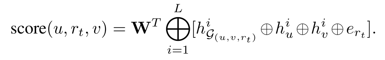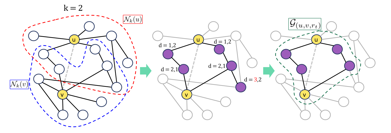 Target 노드를 $u,v$라고 하면 $k$-hop subgraph는 두 노드의 $k$-hop 거리의 이웃들의 교집합에서 $u,v$와의 거리가 $k$를 초과하는 노드들을 제거해 줌으로써 완성된다. 단, directed edge는 이때만 undirected로 취급되며 target edge$(u,r_t,v)$는 잠시 제거된다.