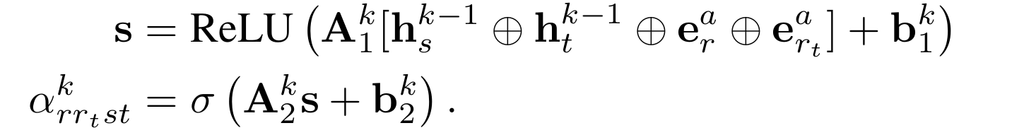 즉 간선마다 attention을 붙여주는데 이는 현재 계산하고자 하는 state의 깊이($k$), 간선의 종류($r$), target relation의 종류($r_t$)에 따라 다른 $s$와 $t$사이의 attention이다. 맥락상 $st$는 표시일 뿐이지 중요한 부분은 아니다. 왜냐하면 $s,t$의 종류에 따라 attention이 다르면 entity dependent 해지기 때문이다. Attention은 아래와 같은 방법으로 구한다.