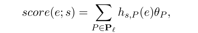 이제 경로가 주어졌을 때 시드 노드에서 종점 노드까지 도달할 확률을 계산할 수 있게 되었다. 여기서 일반적인 상황으로 확장해서 주어진 경로 집합 $P_1,...,P_n$이 있다면 그에 각각 대응되는 $h_{s,P_i}(e)$는 path feature라고 할 수 있다. 즉 아래와 같이 최종적으로 쿼리 노드 $s$에서 출발해 어떤 노드 $e$에 도달할 확률은 다음과 같이 나타낼 수 있다.