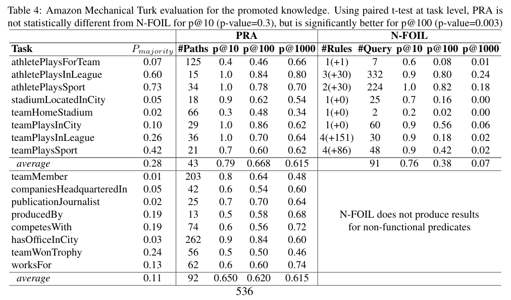 사실 우리한테 중요한 것은 이것이 아니다. 본 연구의 진정한 contribution은 N-FOIL의 방식보다는 2010년에 본 연구의 연구자들이 개발한 Path Ranking Algorithm(PRA)을 여기에 활용한 것이다. 즉 random walk를 사용해 Horn clause inference보다 더 향상된 성능을 보여준다.