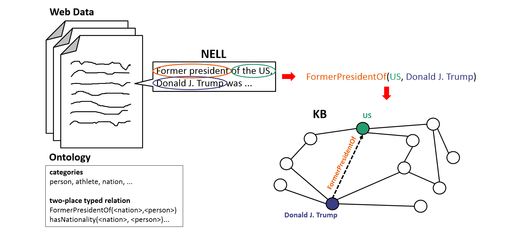NELL은 입력으로 다량의 웹과 ontology를 받는다. 여기서 ontology란 category(주로 명사형의 노드가 될 수 있는 대상의 집합, e.g., person, athlete, sports)와 배우고자 하는 관계(e.g., athletePlaysSprot(<athlete>, <sport>))를 뜻한다. 즉 웹으로부터 ontology에서 요구하는 관계(relation)를 학습하고자 한다. 예를 들어 아래와 같이 정보를 추출해 KB를 채우는 방식을 기대한다는 것이다.