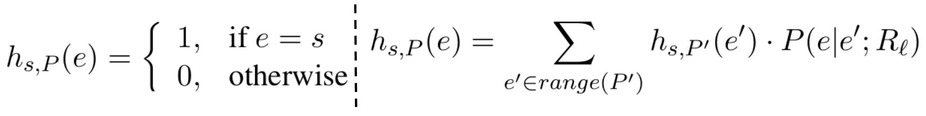 여기서 $P(e|e';R_l)$은 $R_l(e', e)/|R_l(e',\cdot)|$로 정의된다. 즉 경로가 비어있지 않은 경우에 대해서 ($e'$에 도착할 확률)$\times$($R_l(e', e)=1$인 경로에 대한 random walk 확률값)의 총합으로 결정된다. 참고로 $a\overset {R}{\rightarrow }b$를 만족하면 $R(a,b)=1$, 아닐 시에는 $0$이라고 할 수 있다.