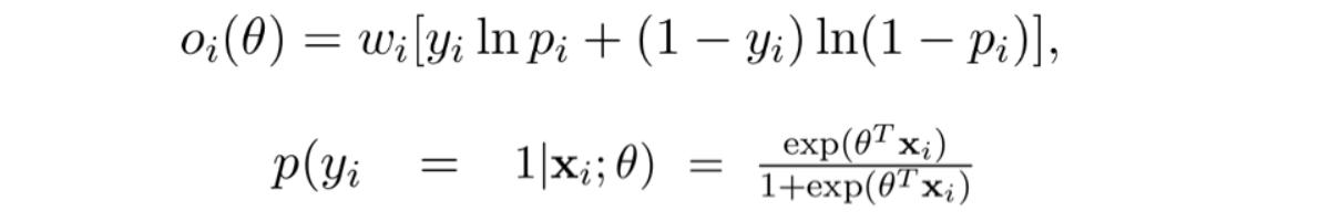 학습될 파라미터들은 $P(y|\textbf{x};\theta)$를 정확히 예측하는 방향으로 로지스틱 회귀로 학습되며 목적 함수는 아래와 같다.