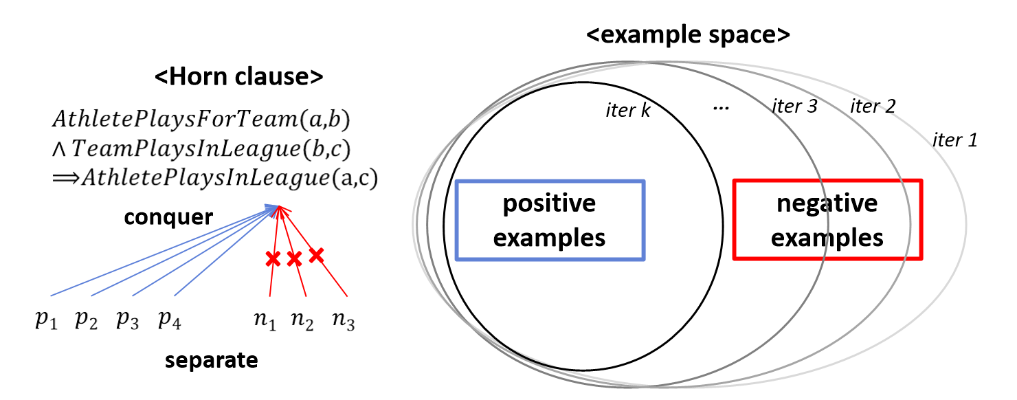 NELL은 FOIL 알고리즘의 변형, N-FOIL을 이용해 rule들을 학습한다. 이는 positive, negative example을 동시에 입력받아 Horn clause가 많은 positive와 적은 negative를 추론하는 방향으로 학습이 진행되며 "separate-and-conquer" 전략을 사용해 학습한 Horn clause들이 data에 fit 되기를 바란다. 구체적으로는 general 한 rule에서 시작해 점차 specialize 하여 Horn clause를 학습한다. 이 과정에서 clause가 학습되면 clause가 성공적으로 추론한 example은(separate) training set에서 제거되고 positive example이 더 이상 남아있지 않을 때까지 이 과정을 반복한다(conquer).