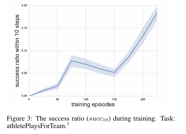 또한 supervised policy learning의 효과도 확인할 수 있다. 아래는 supervised에 사용된 training episode의 개수에 대해 testing에서 10 step 안에 성공적으로 target entity에 도착한 비율을 $succ_{10}$으로 나타낸 것이다.