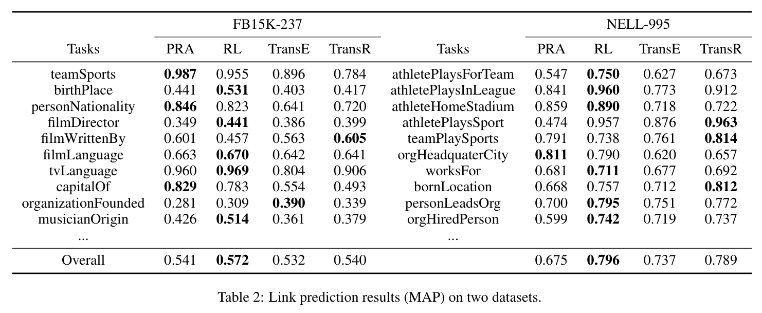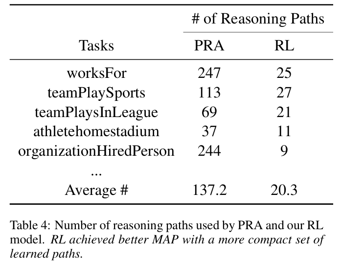 RL(DeepPath)이 PRA보다 훨씬 적은 수의 path를 찾았지만 그럼에도 MAP는 RL이 더 높았다. 이는 RL의 path들이 더 신뢰도가 높다고 해석할 수 있다.