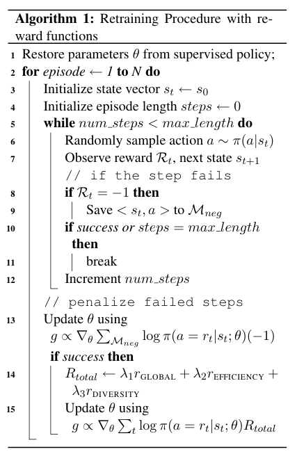Supervised policy learning을 마무리했다면 이제 전적으로 agent의 보상에 따르는 훈련을 할 차례이며 이 단계를 retraining 단계라고 한다.
