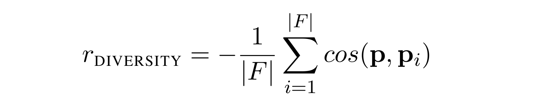 Positive sample은 $(\textbf{e}_{source},\textbf{e}_target)$의 형식을 갖는다. 즉 어떤 positive example에 대해서도 처음 state는 $(\textbf{e})_{source},\textbf{e}_{relation}$로 나타낼 수 있다. 이는 positive sample들의 초기 state가 벡터 공간에서 비슷하게 생길 수 있기 때문에 agent가 탐색한 경로들 사이의 중복, 상관관계가 있을 위험이 있다. 따라서 현재 경로 $\textbf{p}$와 다른 경로들 $\textbf{p}_i$ 사이의 평균각이 클수록 보상이 크다.